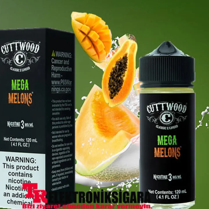 Cuttwood meyve aromalı premium likiti Serinletici tropikal lezzeti sunuyor! Mega Kavunlar, mango, kavun ve papayayı pürüzsüz, tatlı olmayan, ağız sulandıran tropikal bir lezzet oluşturarak dengeler.