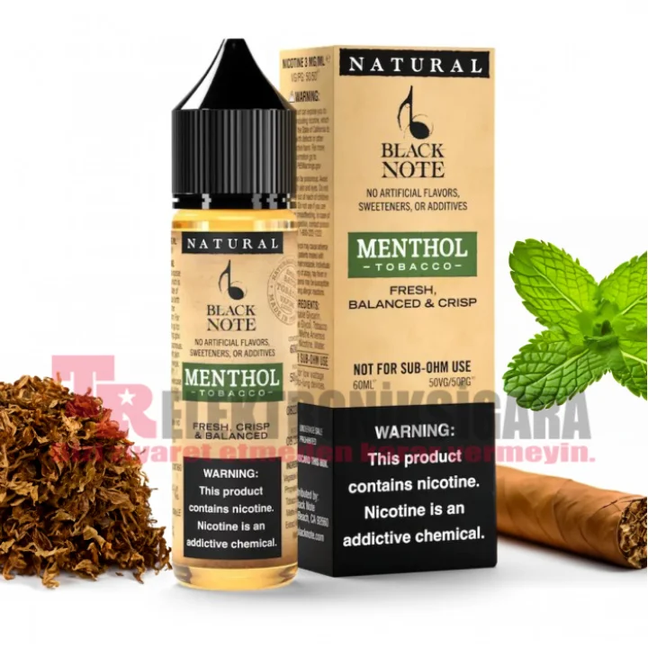 Black Note Menthol Tobacco 60ml Premium Likit, doğal mentol aroması kullanıldığında özellikle taze, keskin, yumuşak ve ultra-pürüzsüzdür. Yüksek kaliteli mentol, öncelikle güneşte kurutulmuş Oriental tütünüyle başlar, ardından gerçek nane yapraklarından elde edilen serinletici bir mentol özüyle kaplanır.