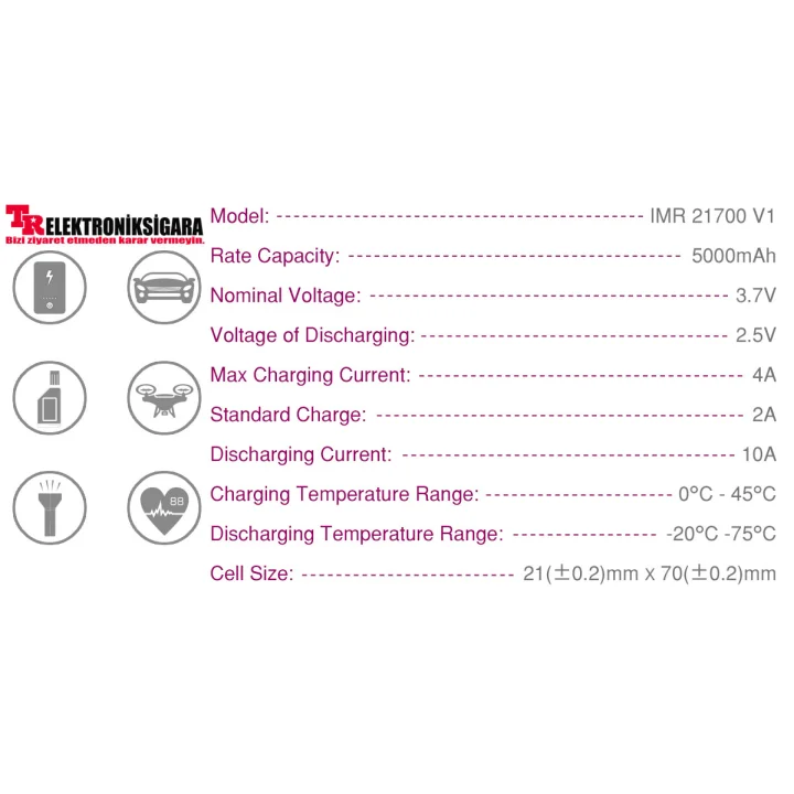 Model: IMR 21700 Li-ion BatteryVoltage: 3.7vAmper 5000mAhSize: 21 x 70 mmInstant Current: 10Ah