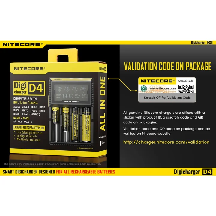 26650, 22650, 18650, 17670, 18490, 17500, 18350, 16340 (RCR123), 14500, 10440 Ni-MH / Ni-Cd:AA, AAA, AAAA, C PACKAGE INCLUDED :1 x NITECORE intellicharger i4 LED Display Charger1 x power cord (battery not included)