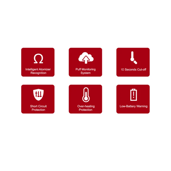 Protection against overheating, Low Resistance Protection, Puff monitoring, Short circuit protection, Overload Protection and 10 second circuit protection are available.