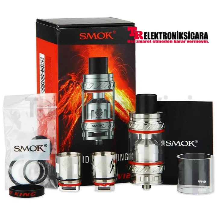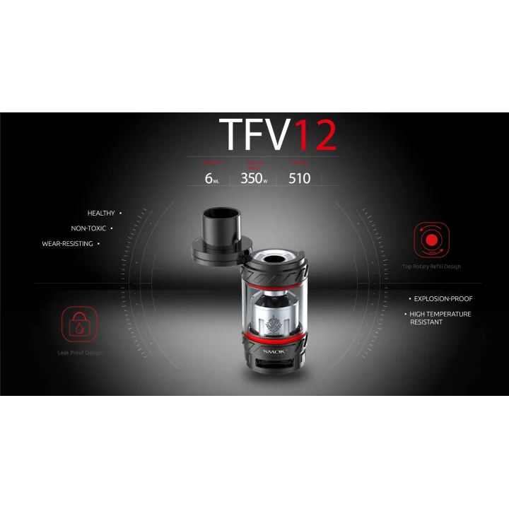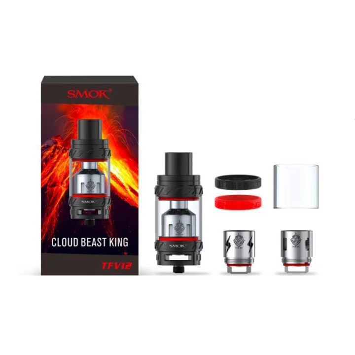 The SMOK TFV12 features a beautiful stainless steel construction design with 6.0ml e-Liquid capacity. The TFV12 uses a high temperature resistant glass with a durable three-dimensional pattern design. It also features a new rotary top filler with a large refill slot to minimize clutter. Get ready to create endless steam with SMOK TFV12 Cloud Monster King Sub-Ohm Tank.