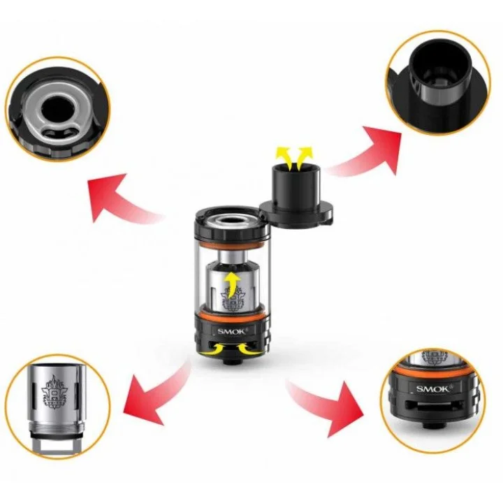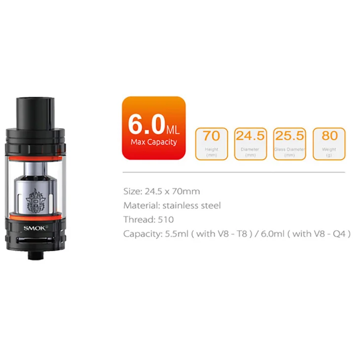 Product DetailsType: Tank AtomizerBrand: SMOKModel: TFV8 THE CLOUD BEASTAvailable colors: Black, SilverMaterial: Glass, Stainless SteelTank Capacity: 6.0mlThread: 510Diameter: 24.5 mm Size and Weight