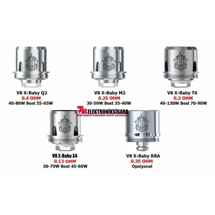 The x-baby atomizer coils listed above are offered in a variety of different sub-ohm coils and constructions, designed to suit each individual's preference. The V8 Baby-X Q2 Dual Coil features a dual coil design orientation and a resistance of 0.4ohm with a range capable of 40 to 80W. The V8 Baby-X M2 is a 0.25ohm dual coil design optimized for mechanical mod functionalities with the ability to perform as a regular sub-ohm coil, featuring compatibility with the SMOK Stick VX. For building enthusiasts, SMOK implements a robust V8 Baby-X RBA Head with a two-post design to accommodate a multitude of build styles and coil structures.