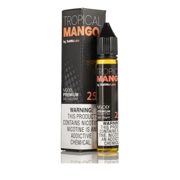Tropical Mango Salt by VGOD SaltNic E-Liquid, lezzetli tropik mangoların gerçekçi bir yorumudur, lezzet dolu, azaltılmış ve bu nefis tatlı buharı yaratmak için nikotin tuzları ile karıştırılmıştır
