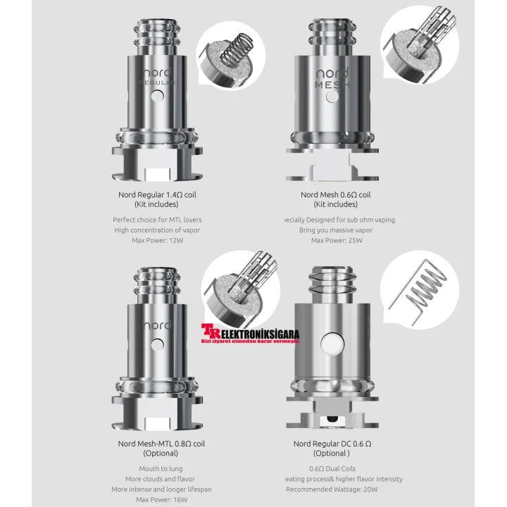 Cevap:Merhabalar, Nord 2 de nord coil takılan kartuş ile kullanabilirsiniz bu coilleri. 1.4 ohm ve 0.8 mtl coilleri sigara içimdir.